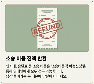 "변호사 비용, 인지대, 송달료 아까워서 소송 못 하겠어요." 걱정 마십시오. 민사소송법 제98조에 따라 소송비용은 패소한 당사자가 부담합니다. 승소 판결 후 ‘소송비용액 확정신청’을 통해, 인지대·송달료 등 소송 비용 대부분을 임대인에게 부담시키게 됩니다. 전부 승소에 가까울수록 비용 부담도 임대인에게 더 많이 돌아갑니다.